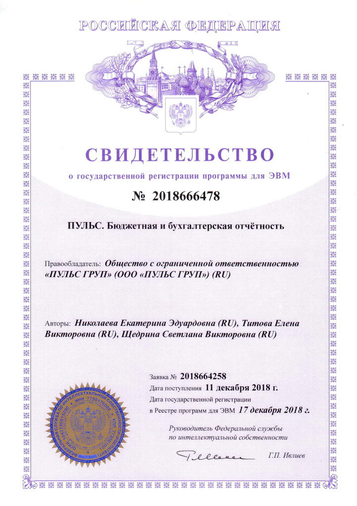 Свидетельство о регистрации программы ЭВМ № 2018664258 от 17.12.18.